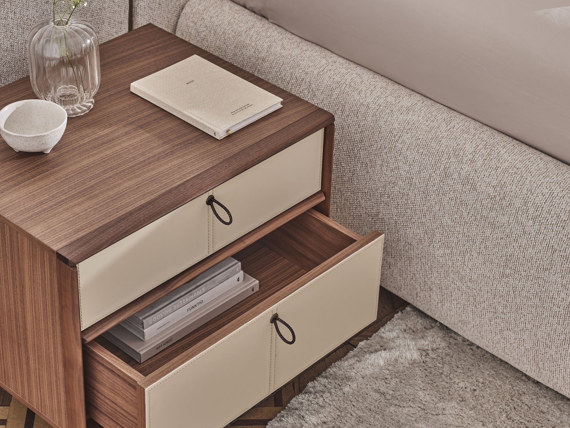 The Bayus collection introduces the new Bayus Night 2 version to expand its range of bedside tables. While maintaining the distinctive style of the collection, this new addition offers a more generous dimension thanks to two spacious full-extension drawers featuring handles with scoubidou effect.