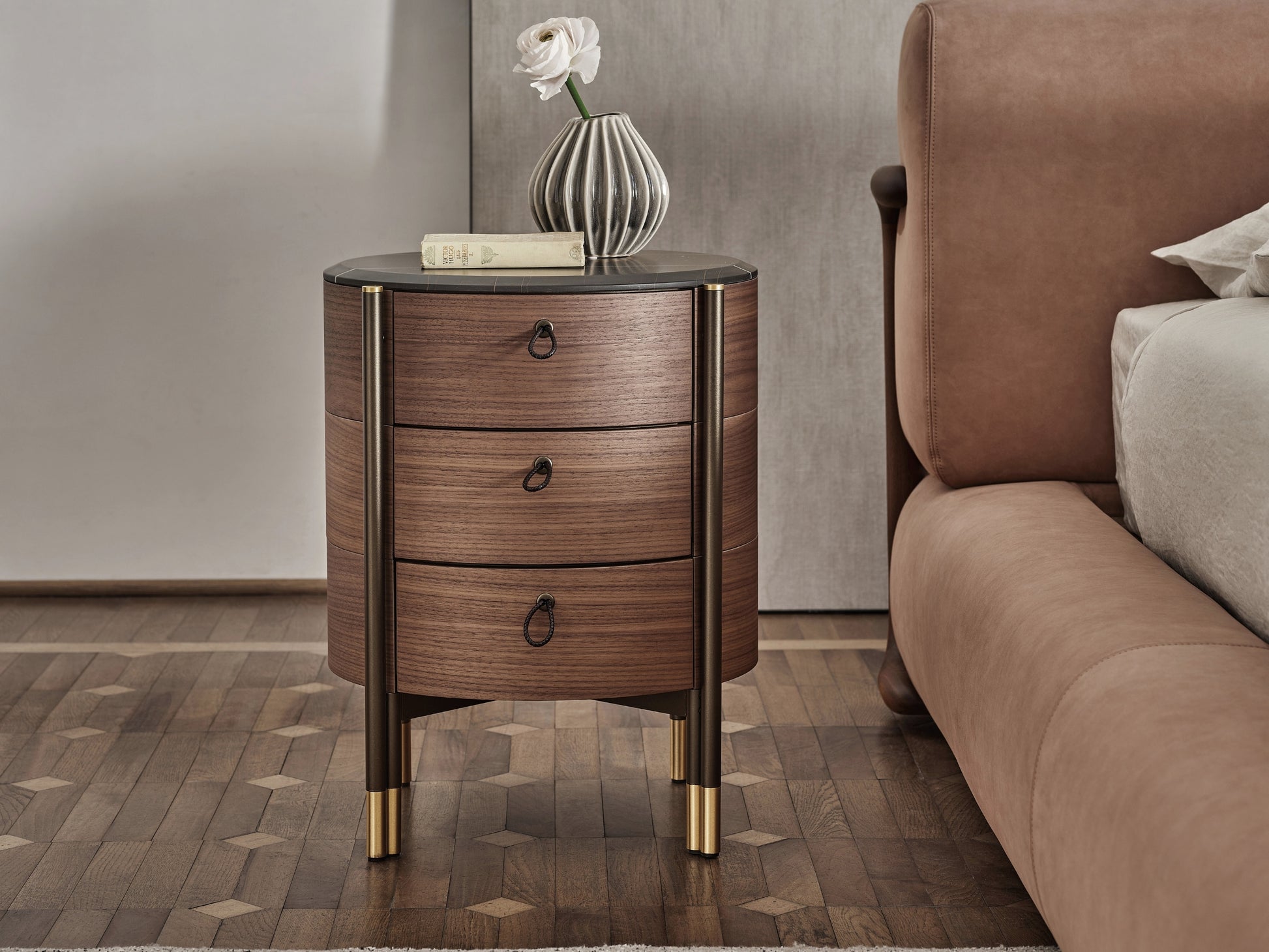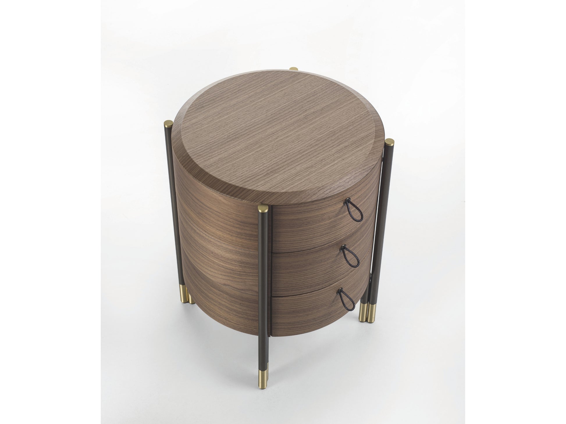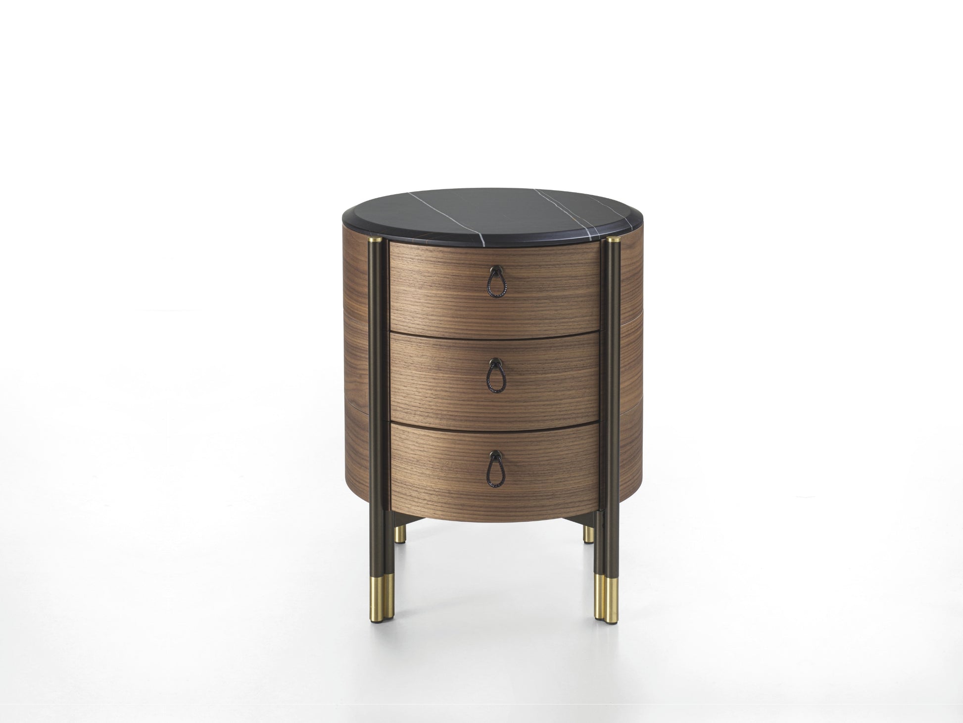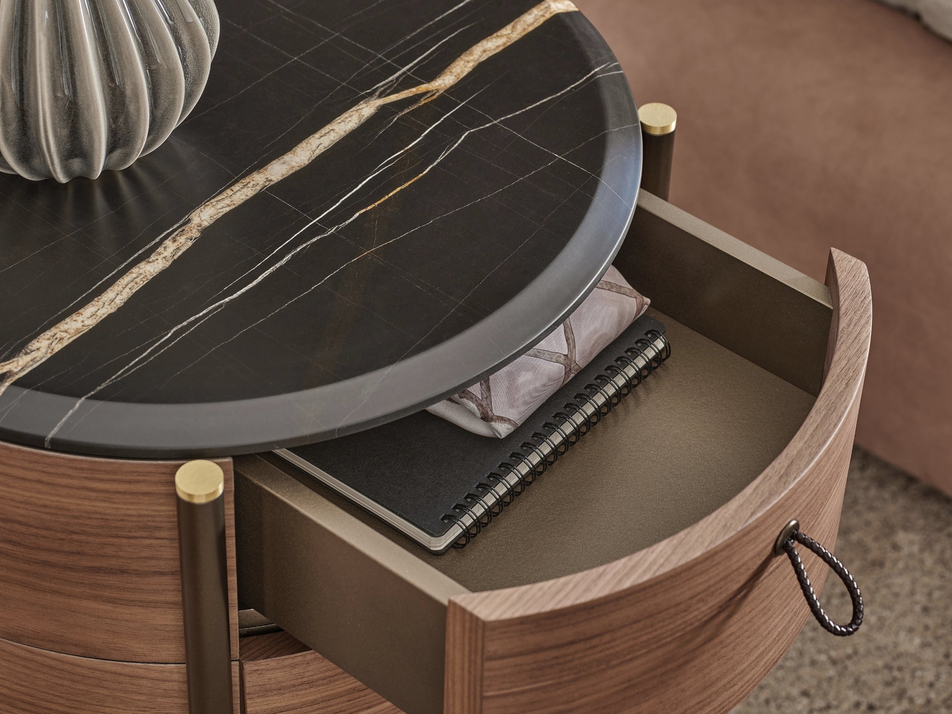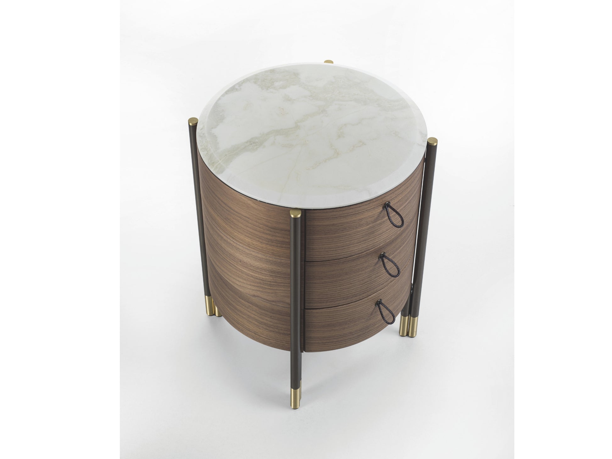 The round bedside table in canaletta walnut is completed with a wooden or marble top. The drawers feature dark brown leather handles with scoubidou effect, while the interior is lacquered with scratch-resistant titanium colour for added durability, perfect for everyday use. The Bronzoro metal base with brushed brass tips represents a signature feature across the entire Bayus collection.