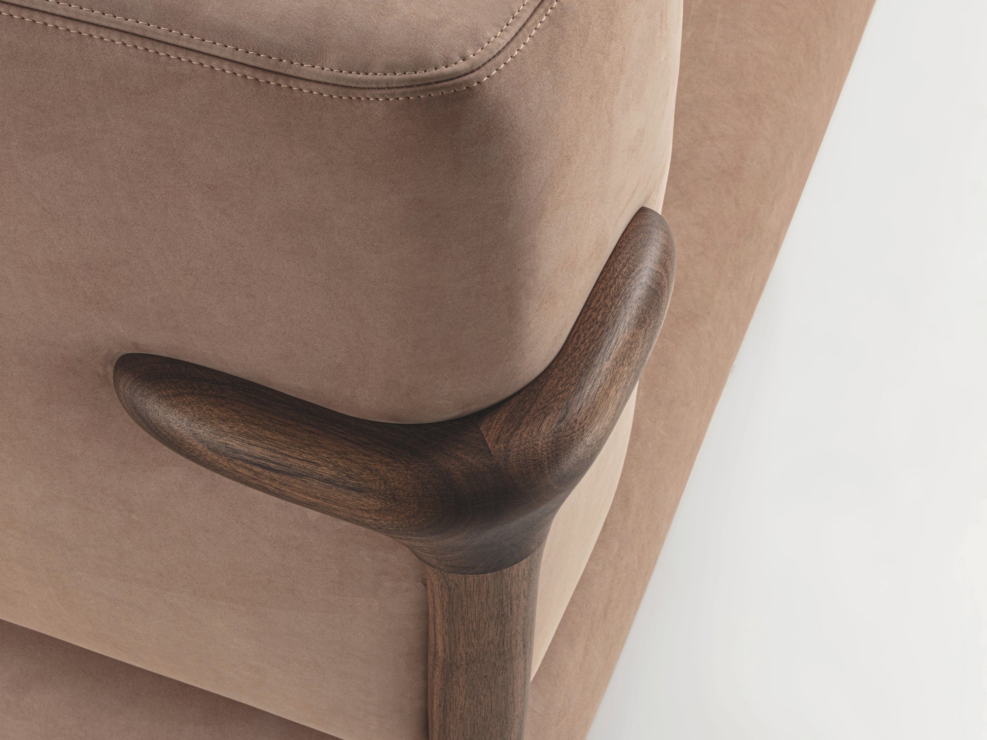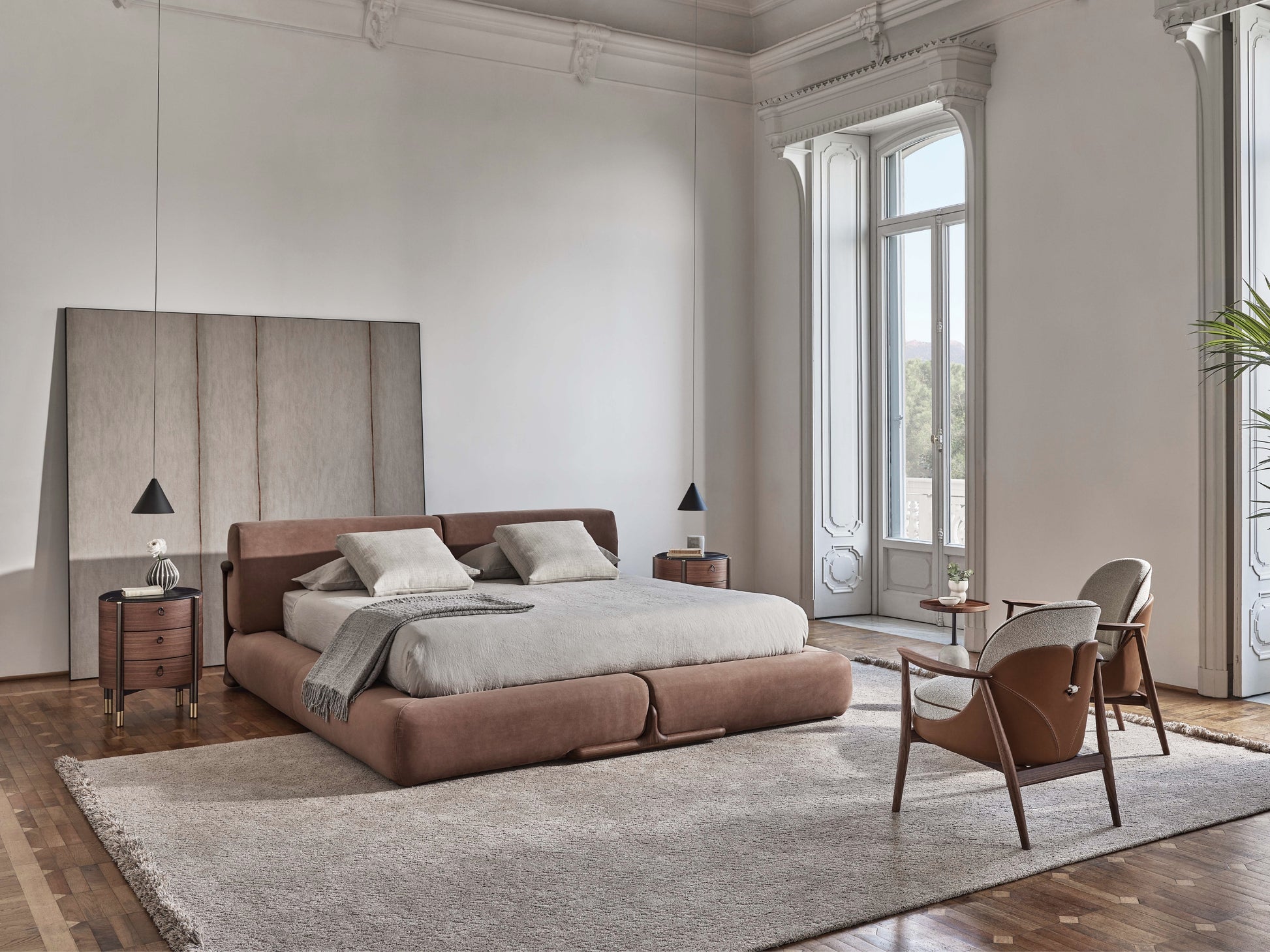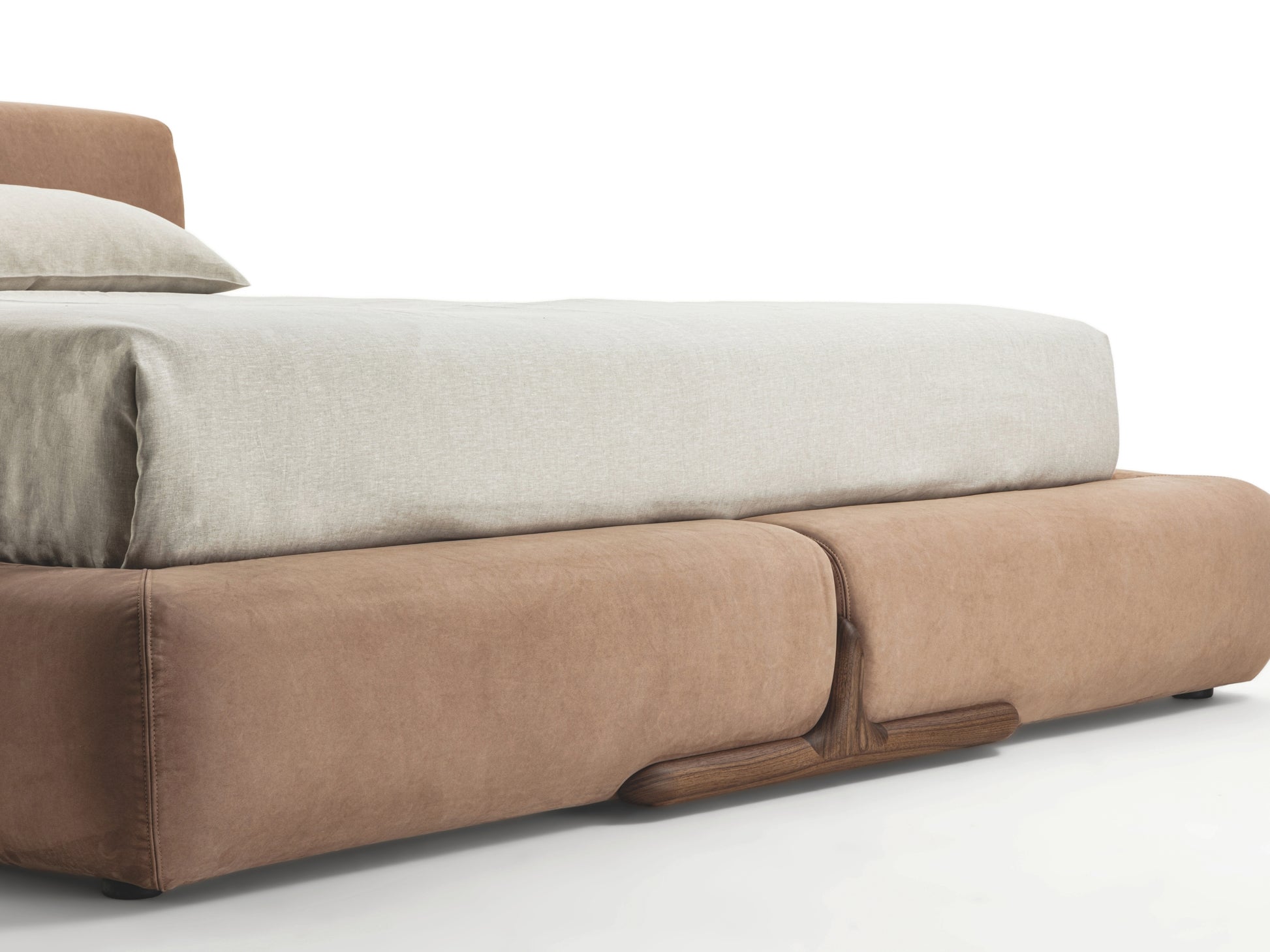 Solid Canaletta walnut elements define the front and sides of the upholstered structure, highlighting the craftsmanship and continuity of the design. The bed is available with removable fabric covers from the collection, or in a non-removable leather version.