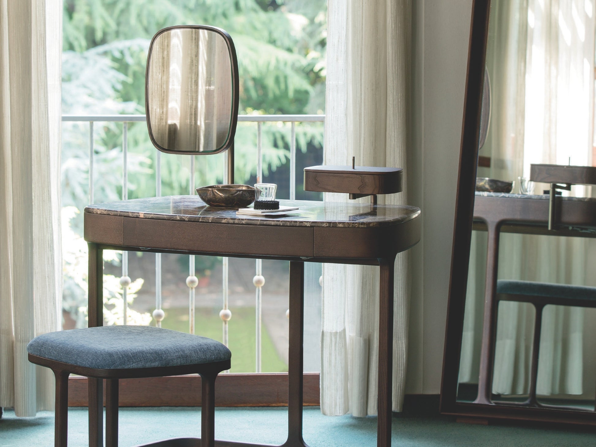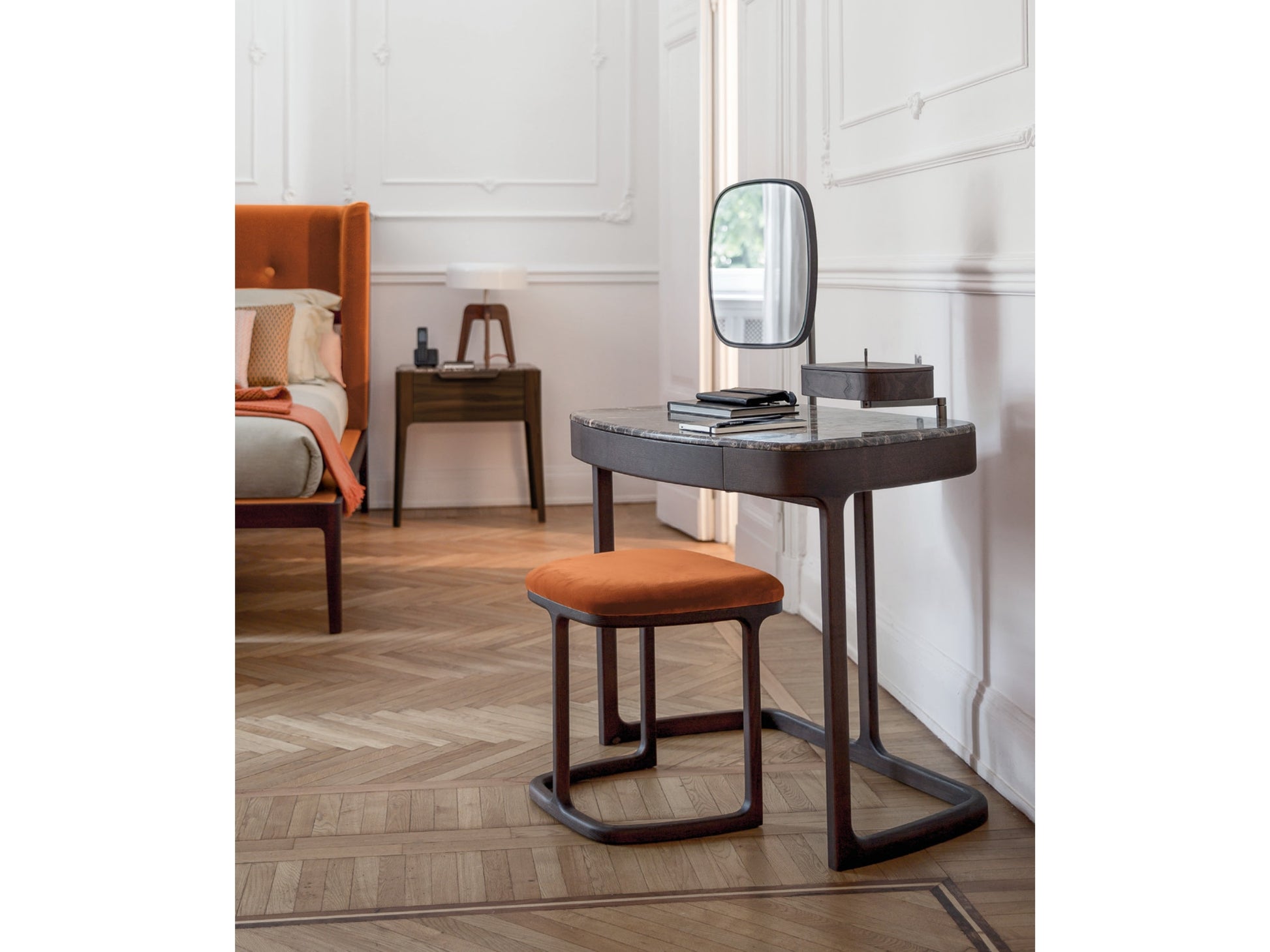 The design is completed with an adjustable mirror framed in brushed bronzed brass and an additional jewellery box. The Maskara collection is complemented by a matching stool, featuring the same rounded lines and an upholstered seat available in all Porada fabrics and leathers.