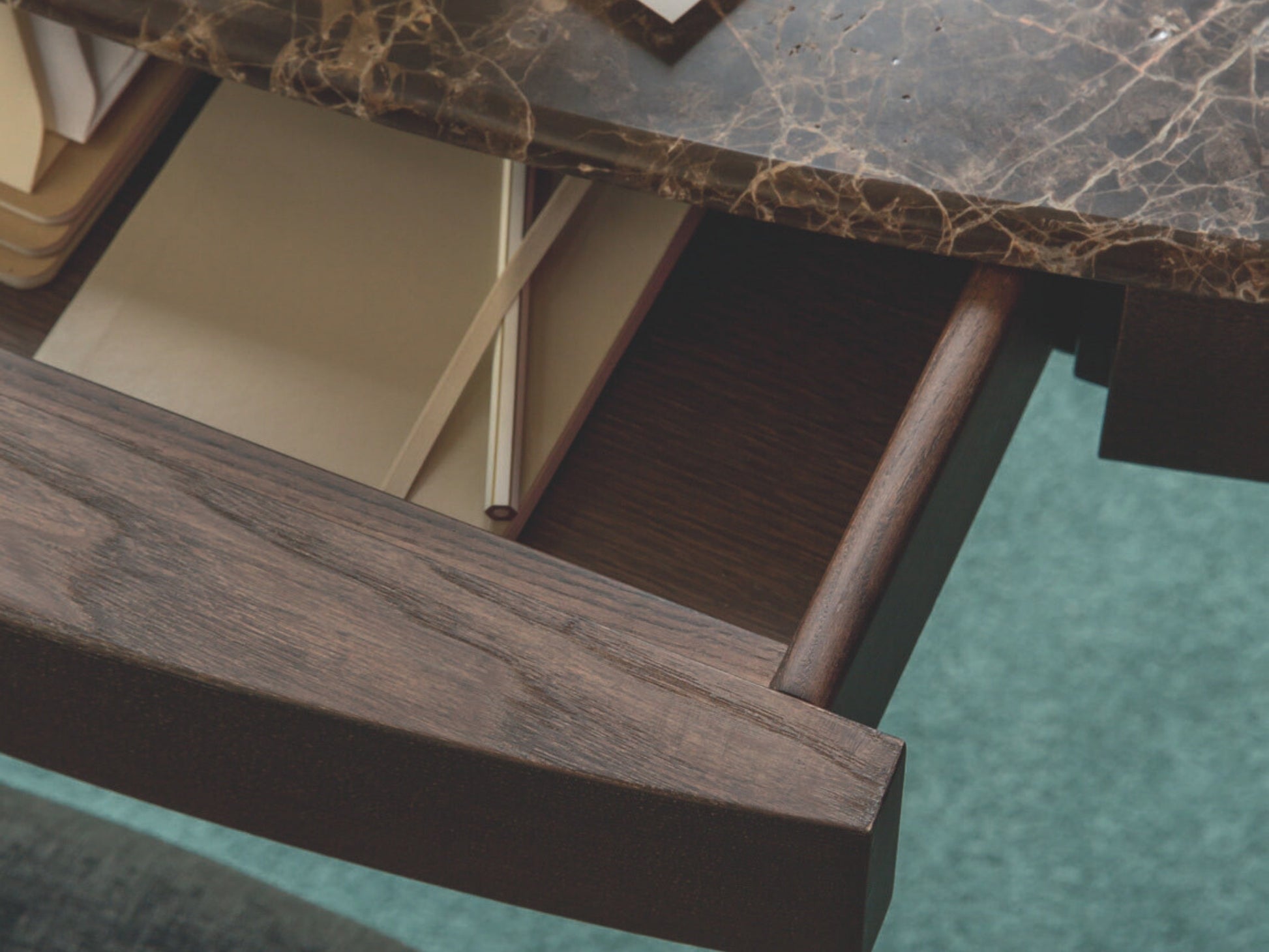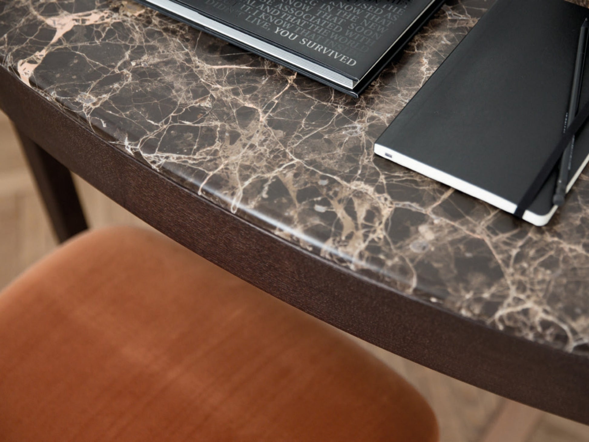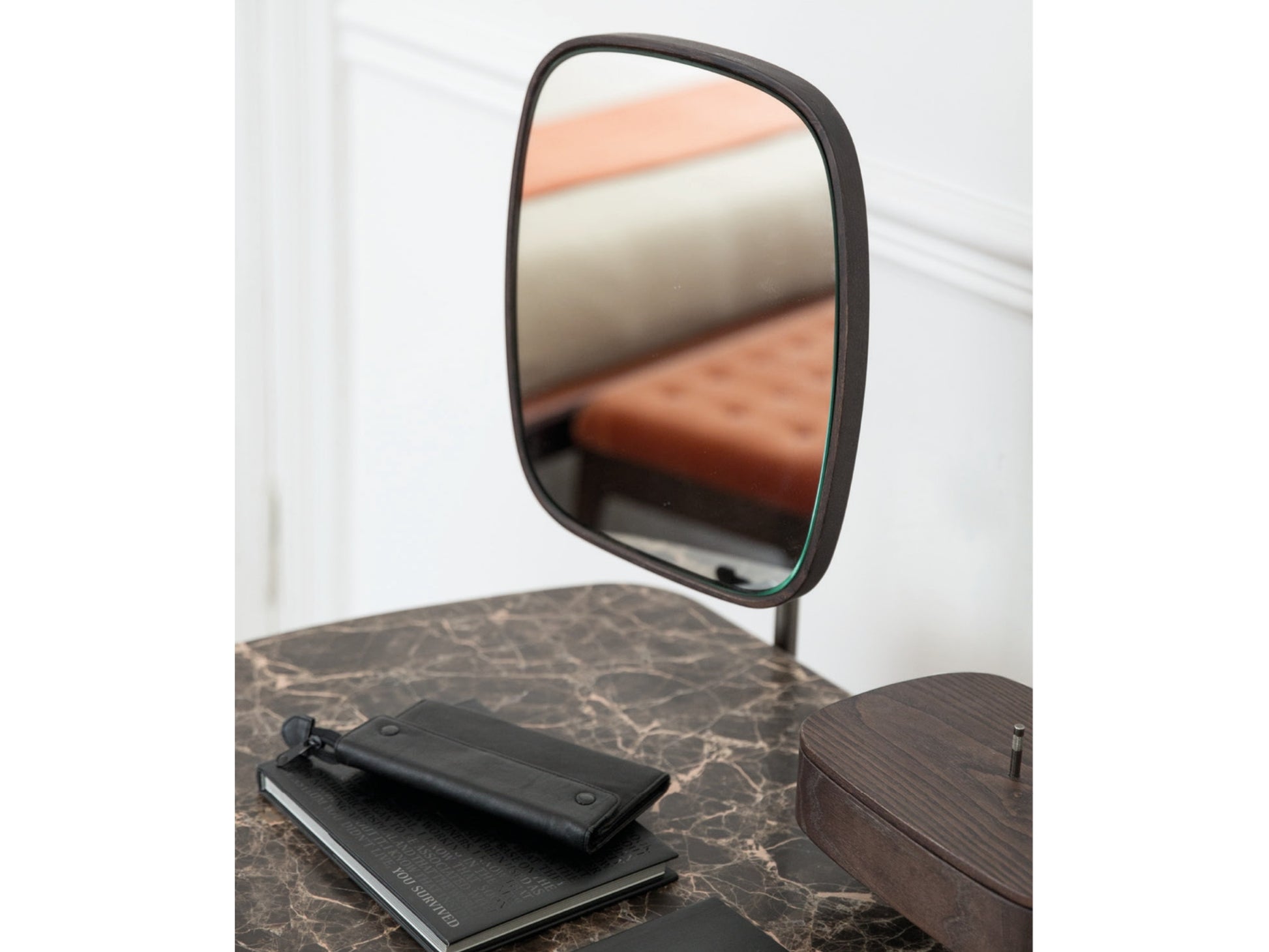 Designed by Emmanuel Gallina for Porada, Maskara is a refined dressing table defined by its compact, elegant proportions. The solid ash frame, sourced from Porada’s own sustainably managed forests, is available in all collection finishes and discreetly integrates a central drawer for everyday storage. A luxurious marble top rests gracefully on the softly contoured structure, enhancing its sculptural appeal.