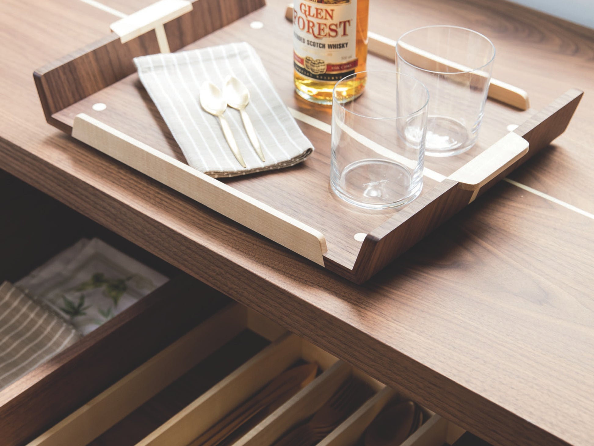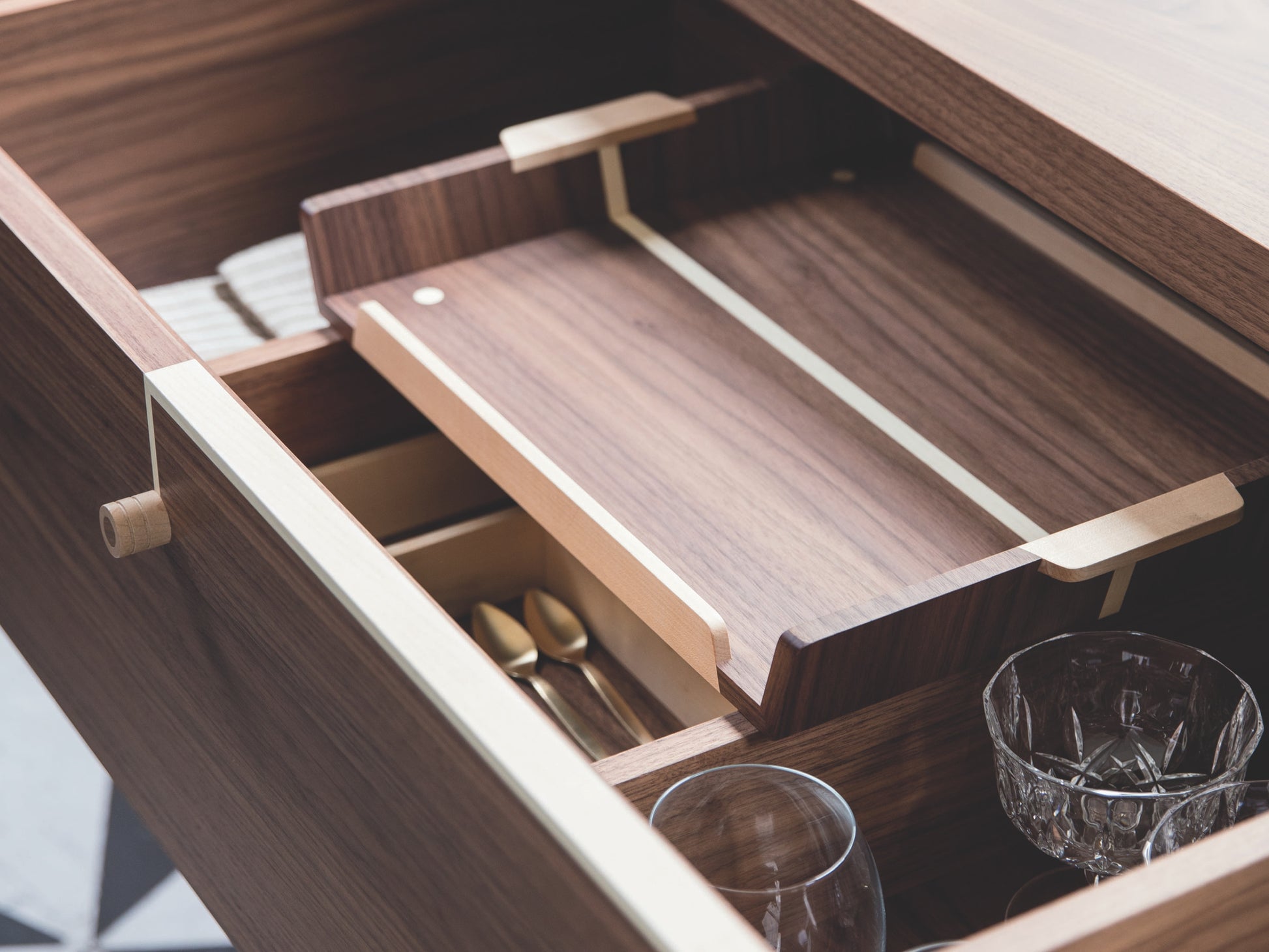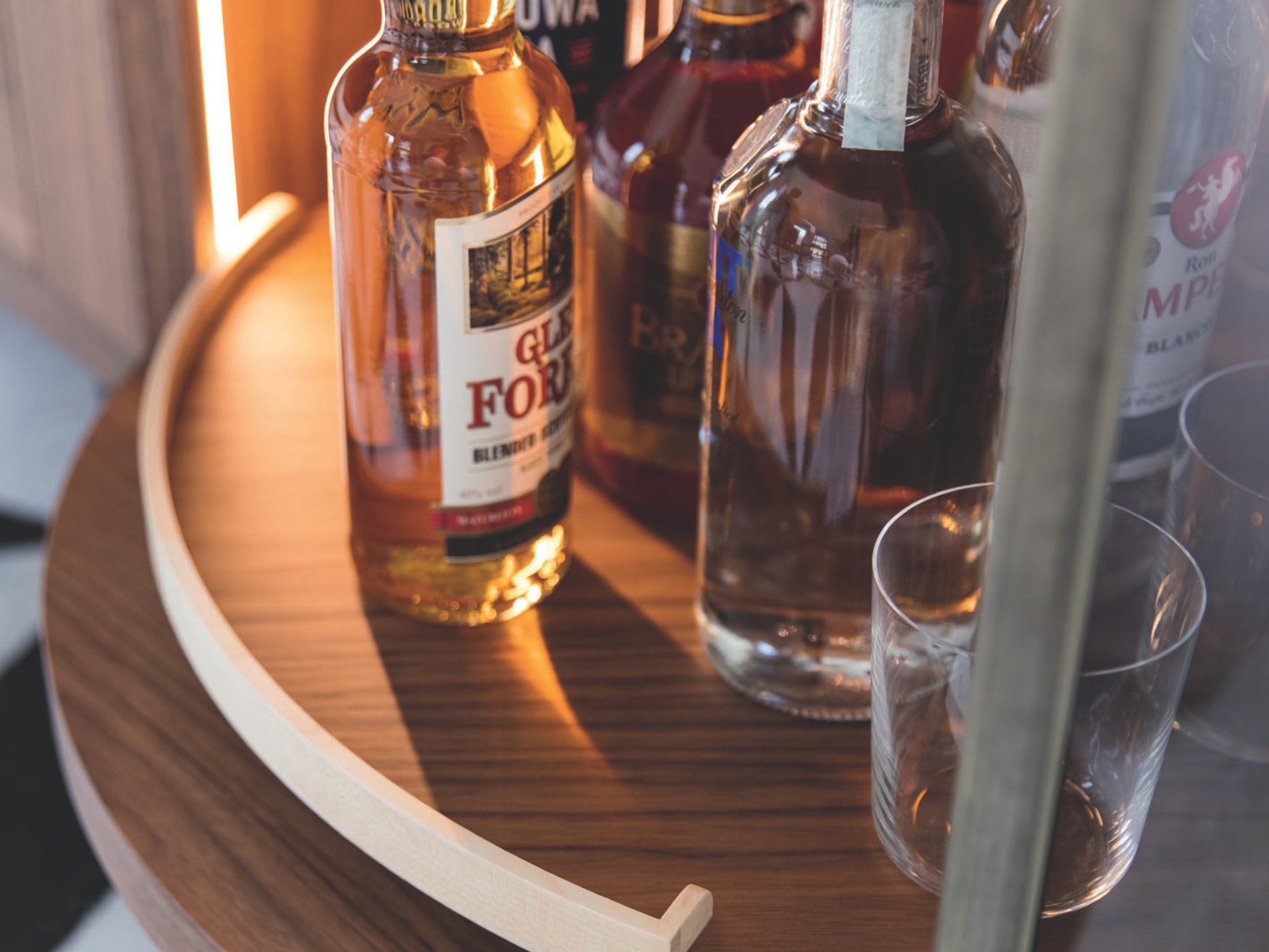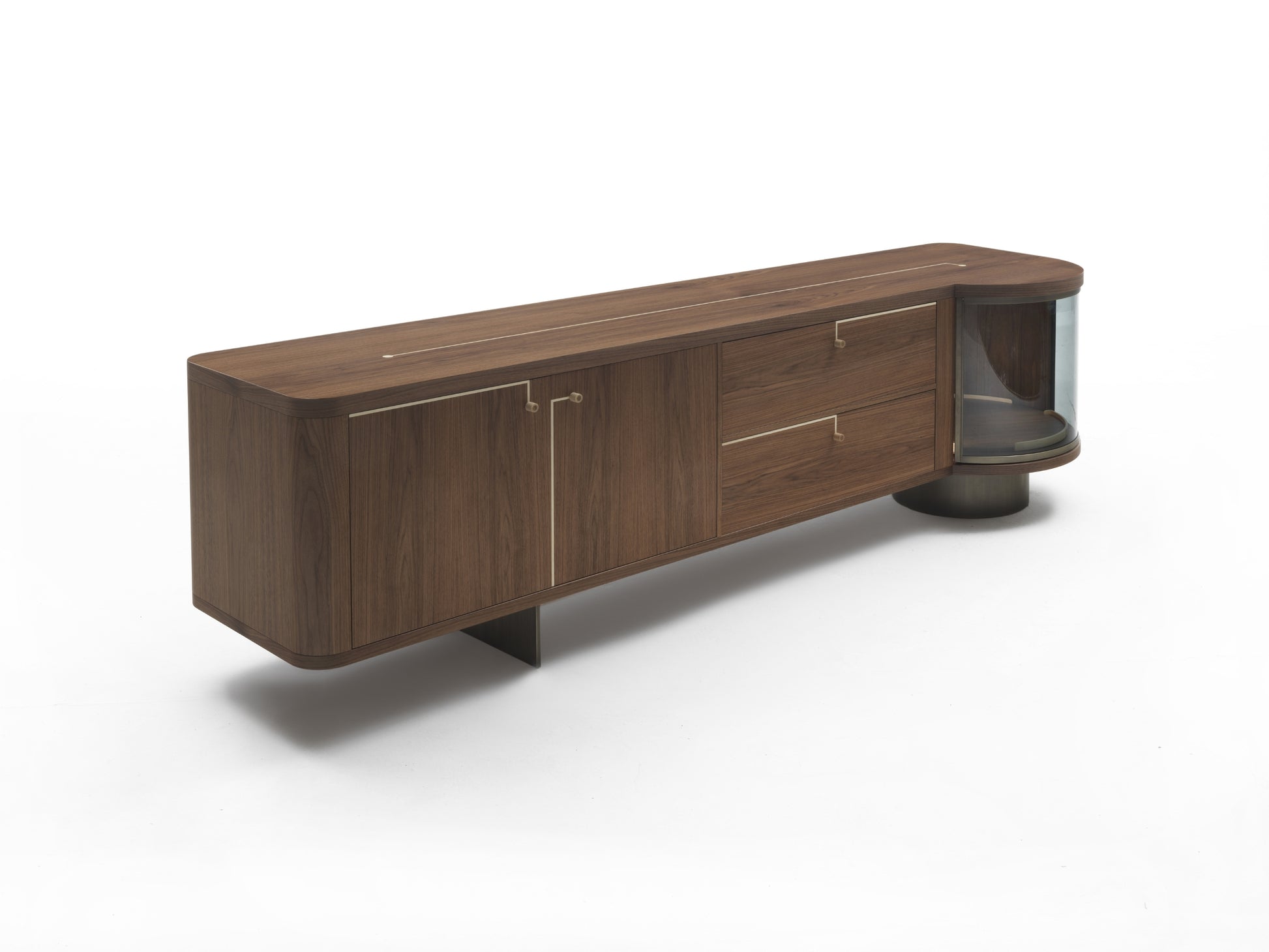 In the version with the bar unit, the module is always on the right, and it is equipped with a curved smoked glass door. Aesthetic perfection is combined with incomparable functionality guaranteed by the presence of a practical swivelling bottle tray and a cutlery and glass holder compartment in one of the two wooden drawers. The compartment is also equipped with led lighting.