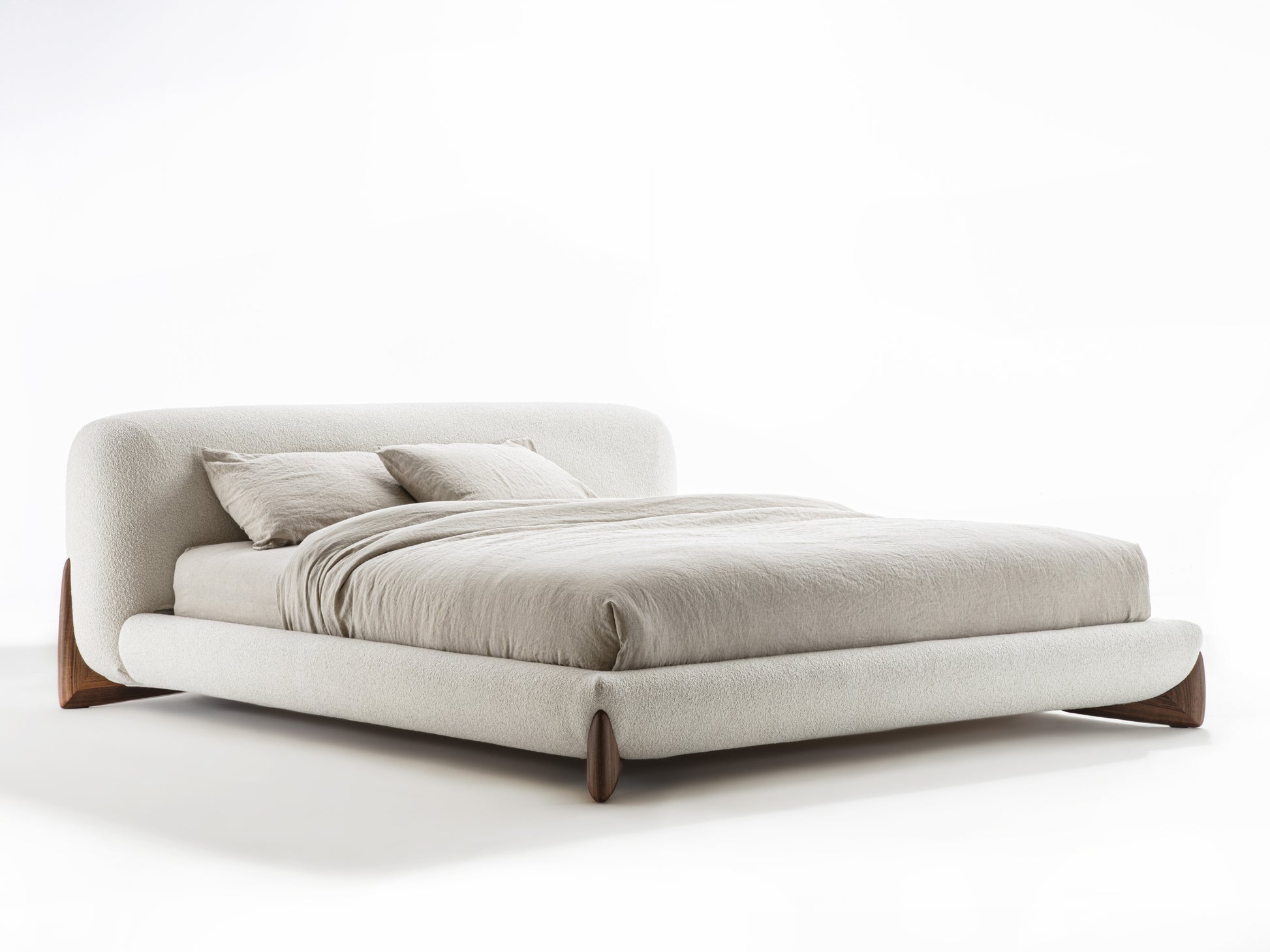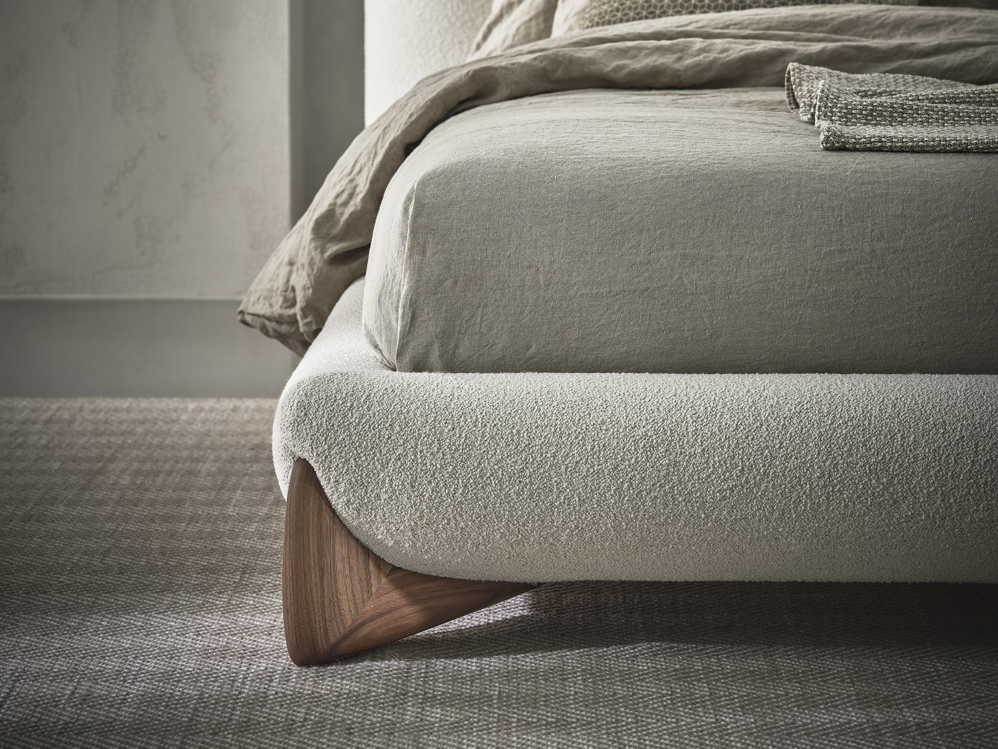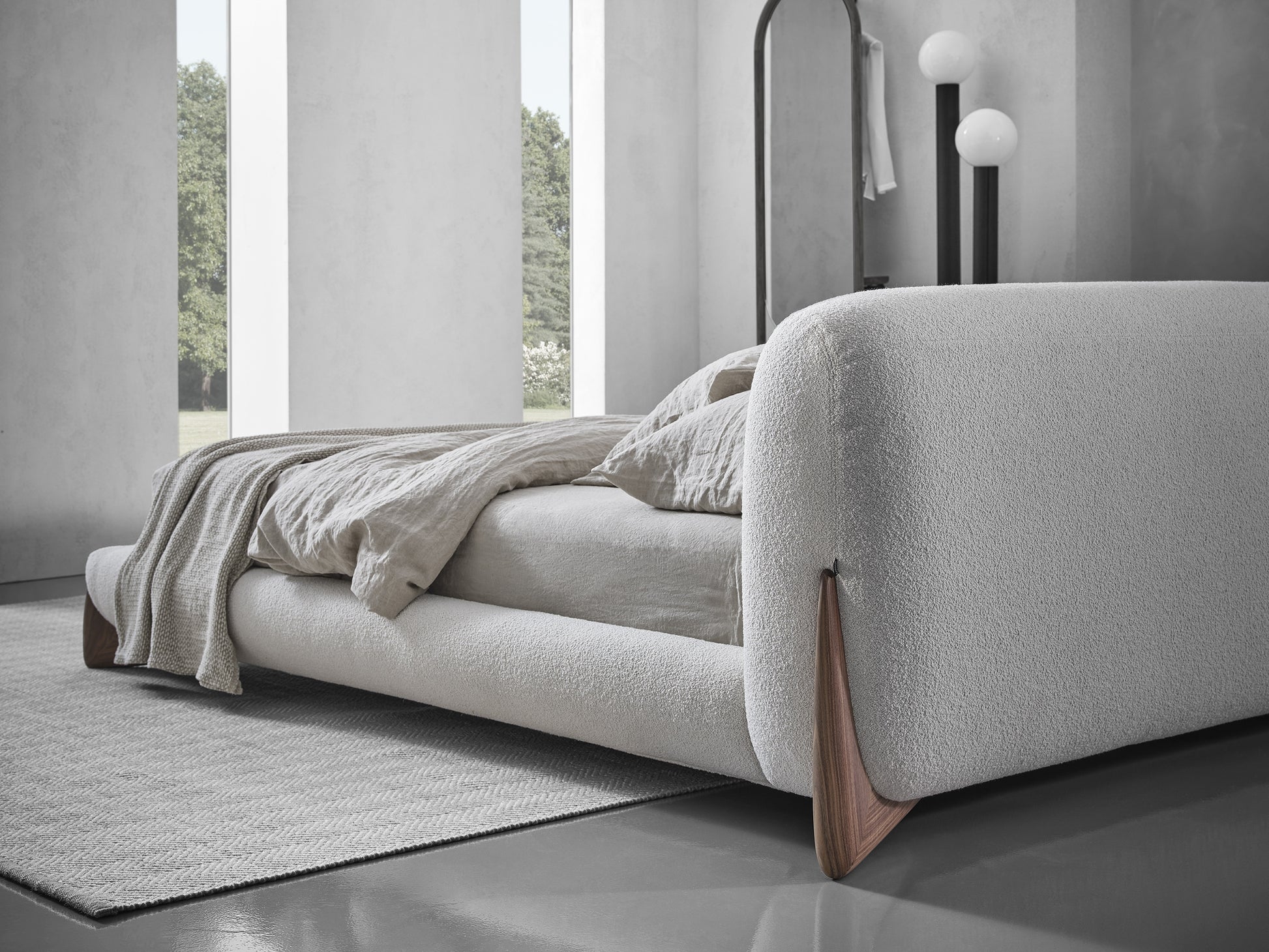 The bed is available in a wide selection of fabrics and leathers from the collection, making it versatile for different interior styles. Among them, the Bouclage fabric, a refined blend of cotton, linen, and wool, most beautifully enhances the design’s softness and sculptural presence.