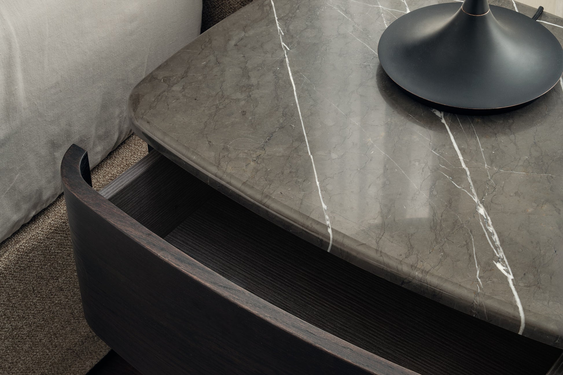 The SOLARA Bedside Table integrates elegance with its soft curves and its beautiful marble top. It features two generously sized drawers, providing seamless bedside storage. For those seeking an added level, custom-made drawer inserts and trays are available upon request, offering enhanced organisation.
