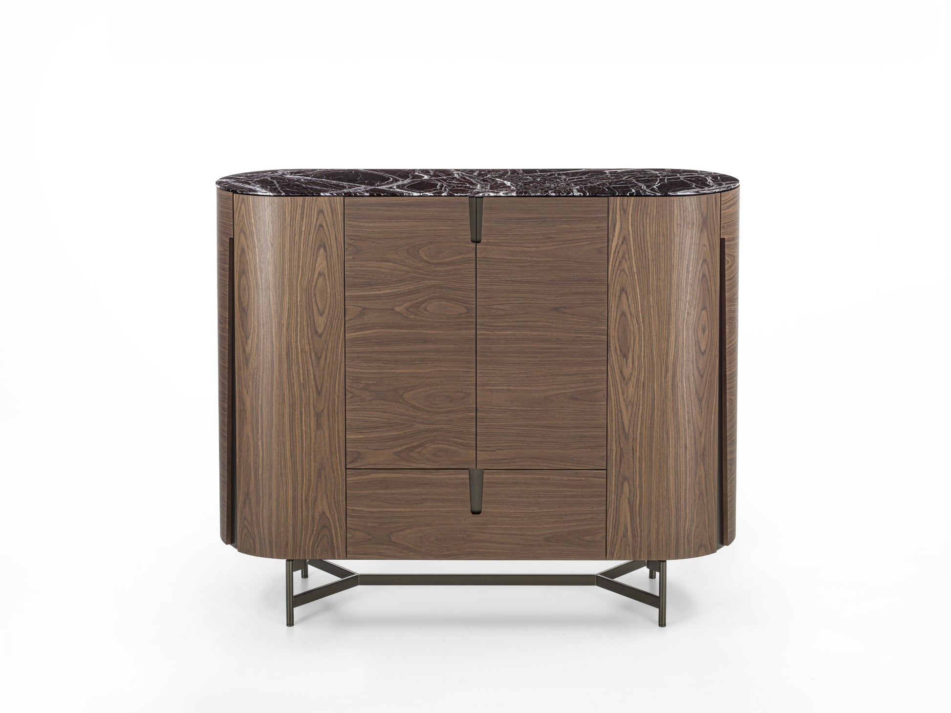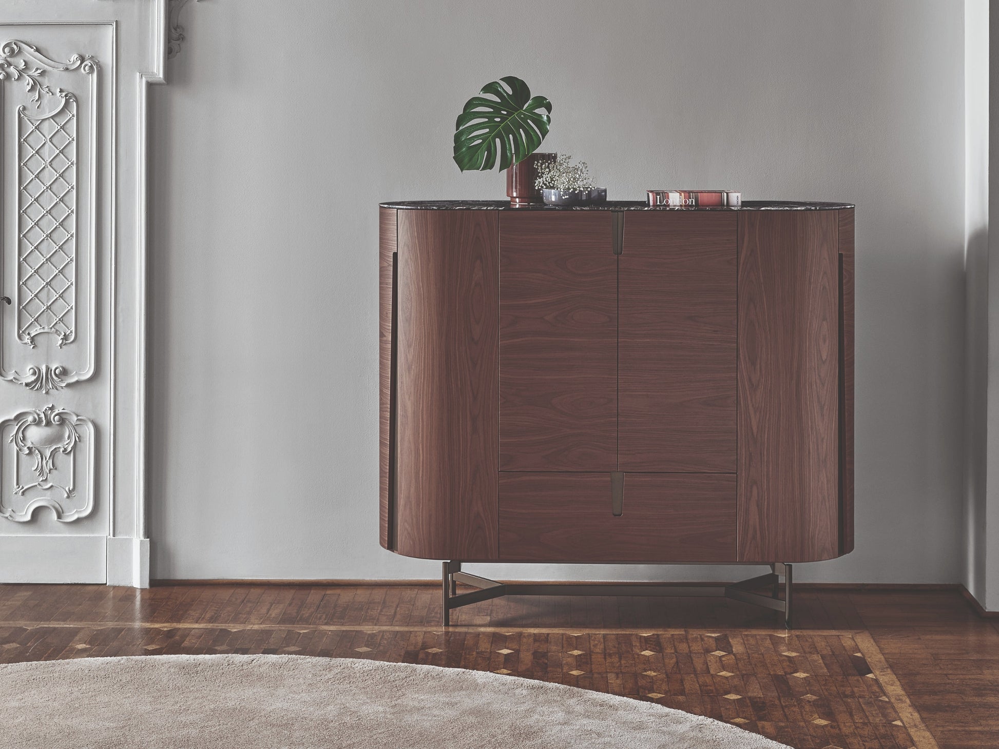 The unit also includes an internal and an external drawer, both equipped and lined with leather. An additional touch of elegance and practicality is provided by LED lighting inside all compartments, allowing the bar to be used even in low-light settings. The recessed handles in Bronzoro metal add a distinctive and contemporary character to the piece. The top of the unit is available in either matching wood or marble.