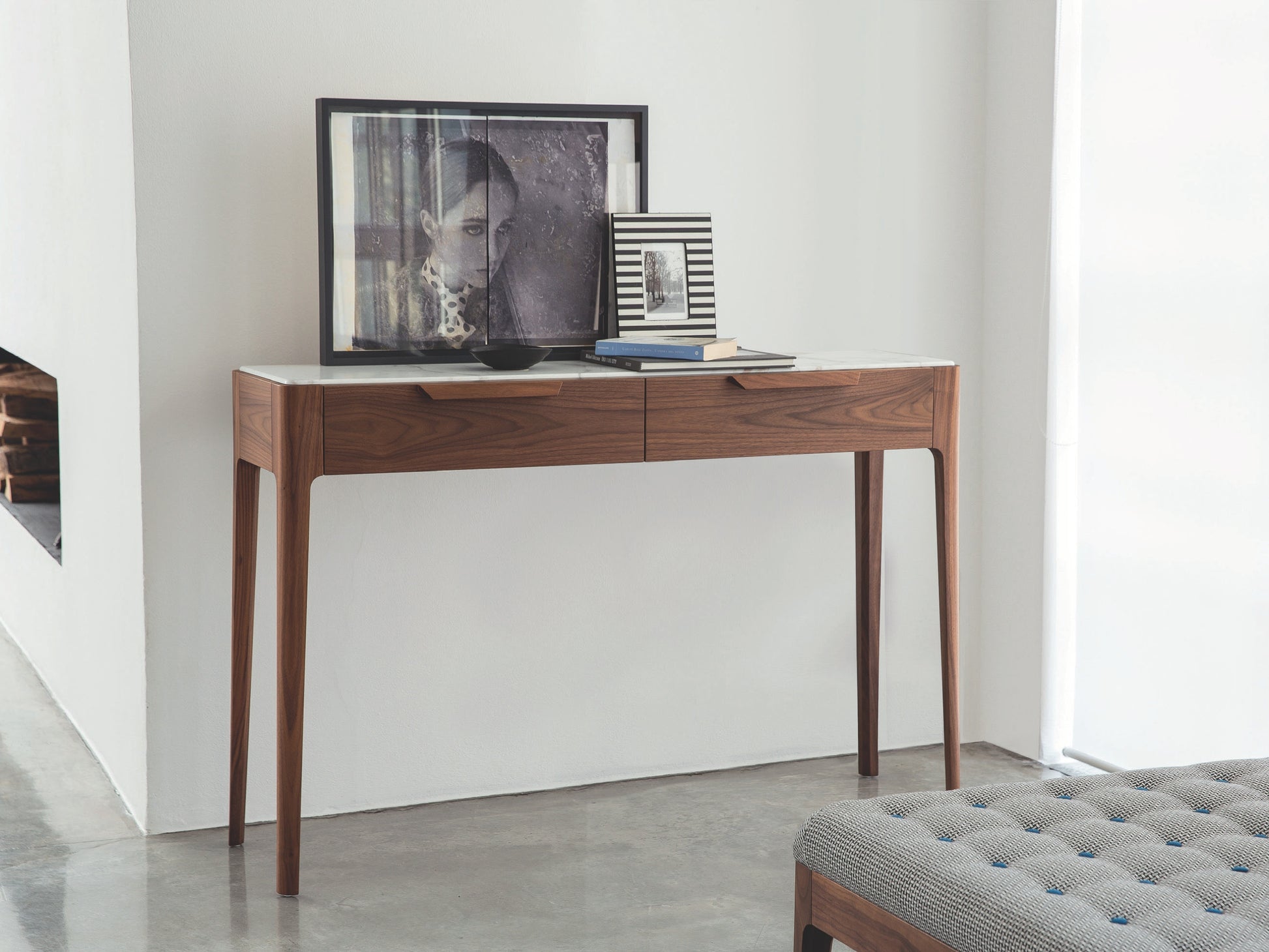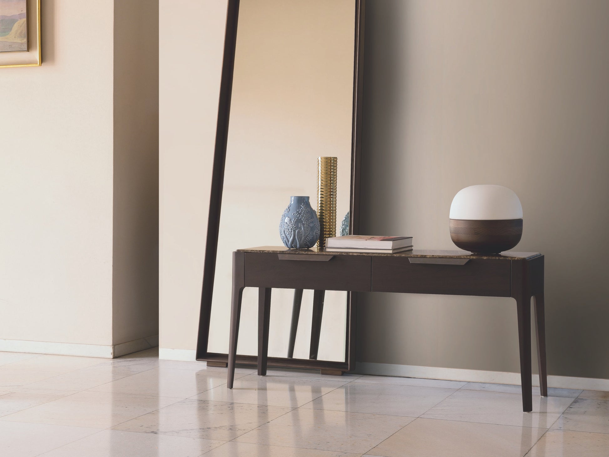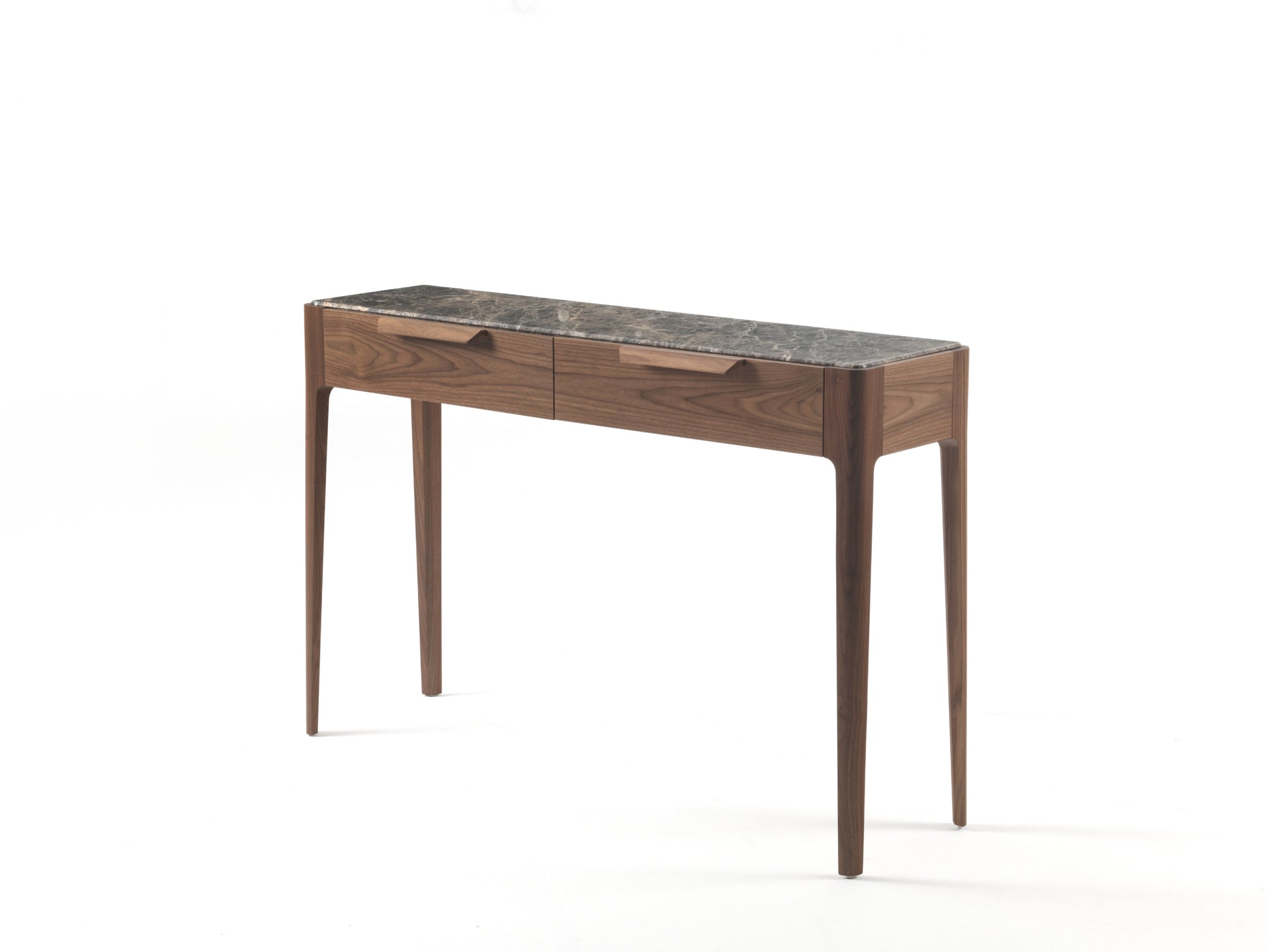 The wood grains, clearly visible on the legs and on the base supporting the top, contribute to the creation of a natural and genuine look. The top is crafted from precious marble and is available in four different colours.